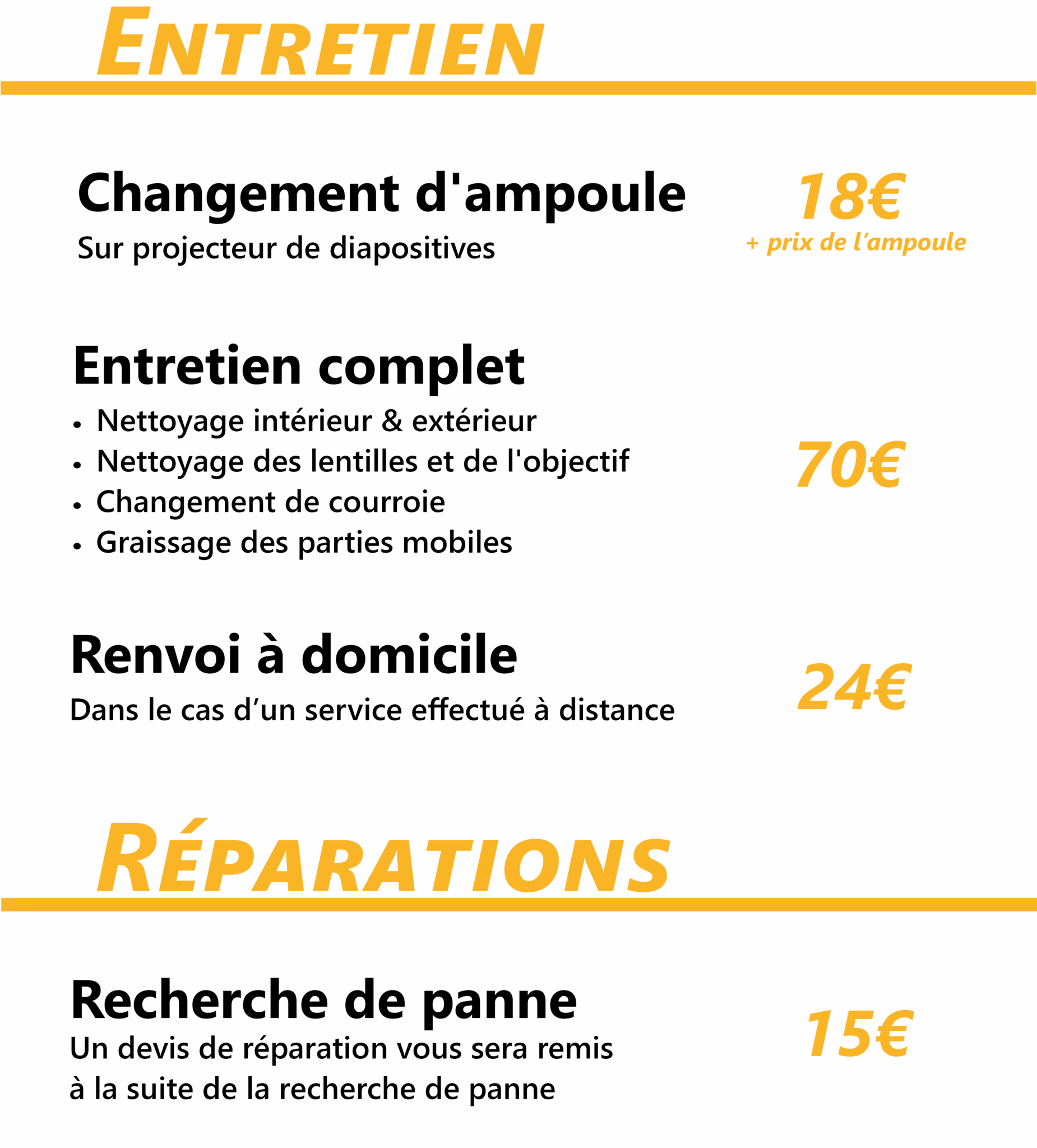 Grâce à notre savoir-faire, et notre stock de pièces détachées, nous pouvons entretenir et réparer une grande partie des projecteurs de diapositives de toutes les marques comme les Prestinox, Kodak, Kindermann, Gaf, Liesegang, et bien d’autres encore.