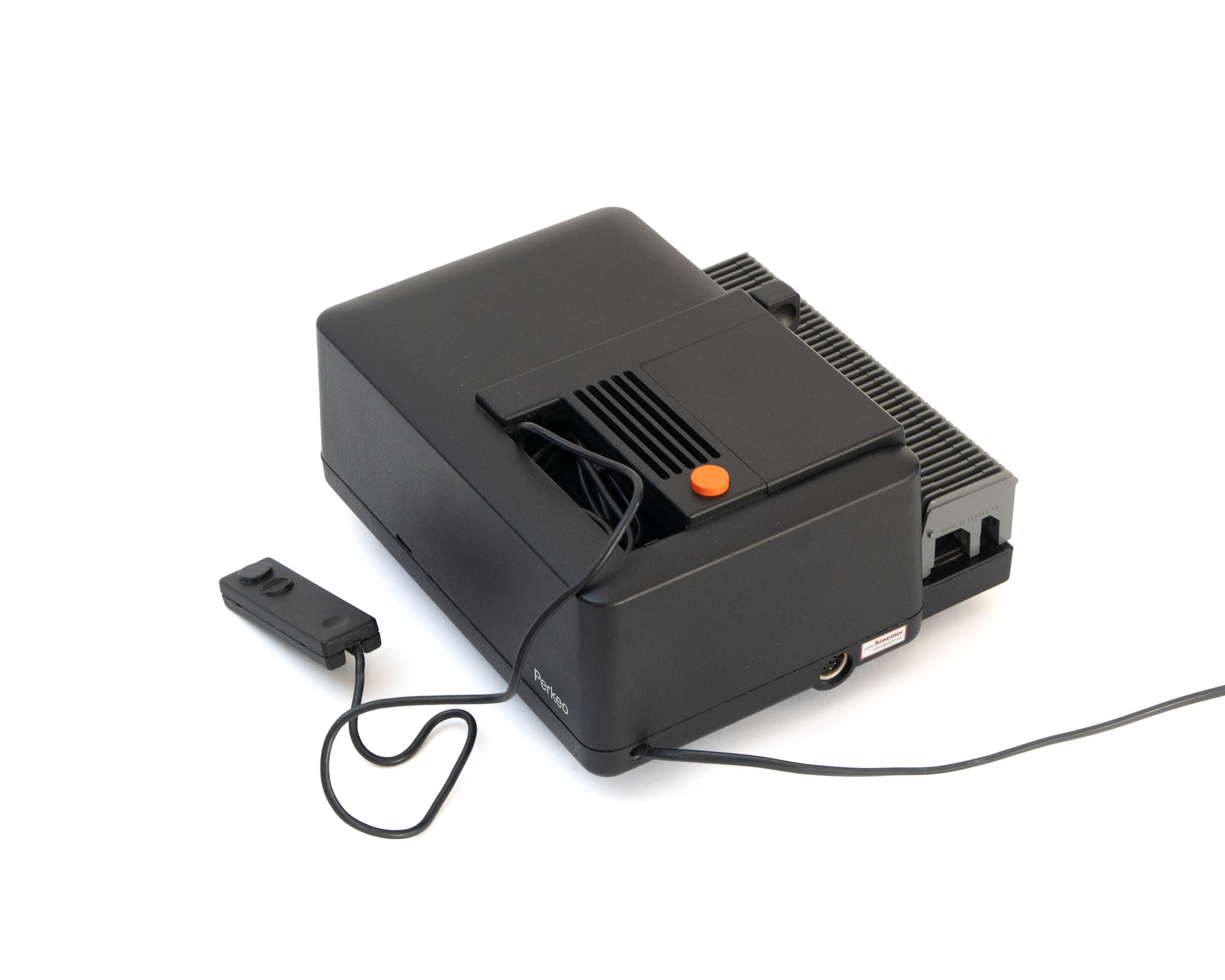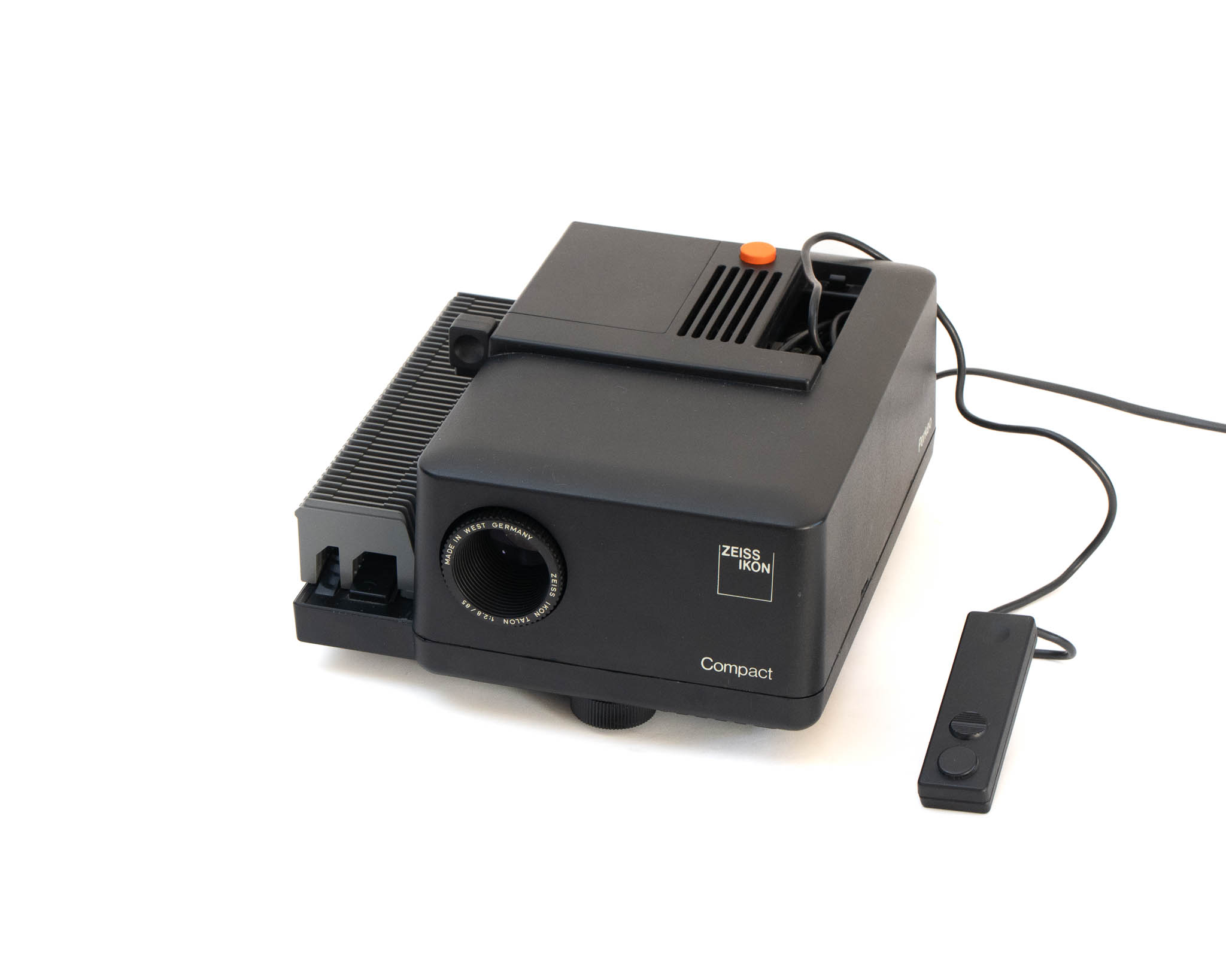 Projecteur de diapositives Zeiss Ikon Compact reconditionné, fourni avec sa télécommande, et un panier de projection pouvant contenir au moins 36 diapositives (la taille peut varier de 36 à 50 emplacements suivant les exemplaires).